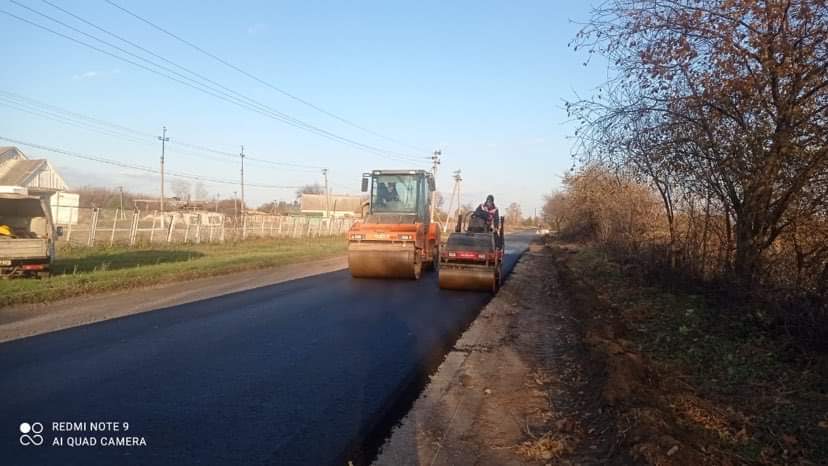Працівники компанії влаштовують останні метри верхнього шару асфальтобетону на дорозі С 191573 – під’їзді від О 191505 до с. Кіндратівка.
