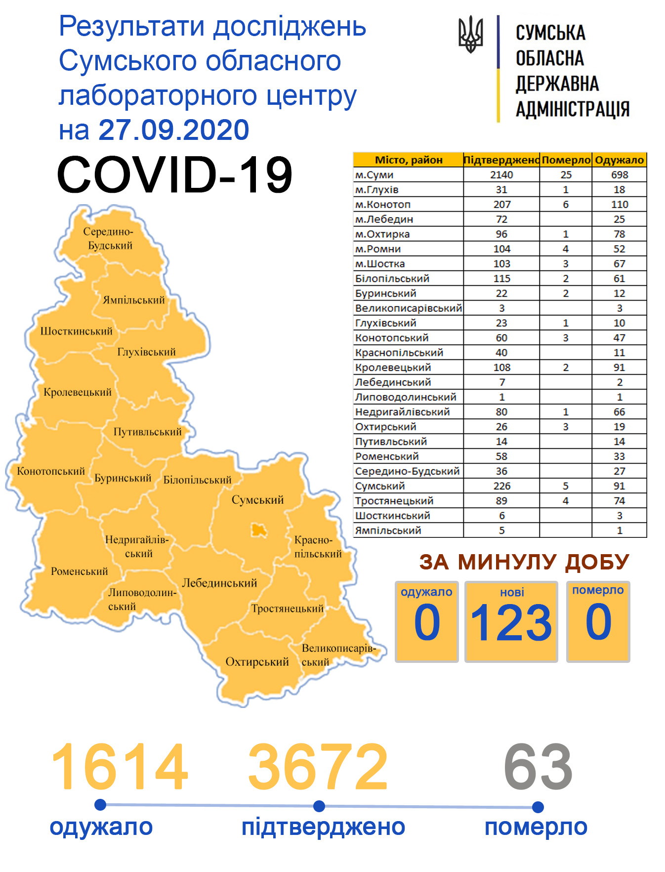 За минулу добу Covid-19 підтвердили у 123 осіб: Суми – 65, Шостка – 6, Конотоп – 18, Глухів – 1, Лебедин – 14, Білопільський р-н – 8, Глухівський р-н – 1, Конотопський р-н – 1, Краснопільський р-н – 3, Лебединський р-н – 1, Роменський р-н – 2, Охтирський р-н – 1, Сумський р-н – 1, Шосткинський р-н – 2.