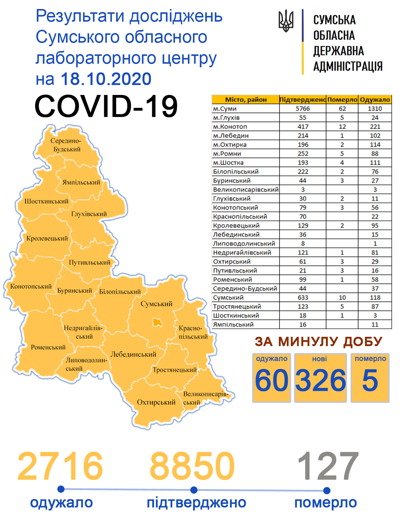 За минулу добу Covid-19 підтвердили у 326 осіб: Суми – 189, Шостка – 11, Конотоп – 26, Ромни – 7, Лебедин – 41, Білопільський р-н – 18, Буринський р-н – 1, Конотопський р-н – 1, Краснопільський р-н – 1, Лебединський р-н – 8, Л. Долинський р-н – 1, Сумський р-н – 21, Шосткинський р-н – 1. Про це повідомляє Сумський обласний лабораторний центр МОЗ України.