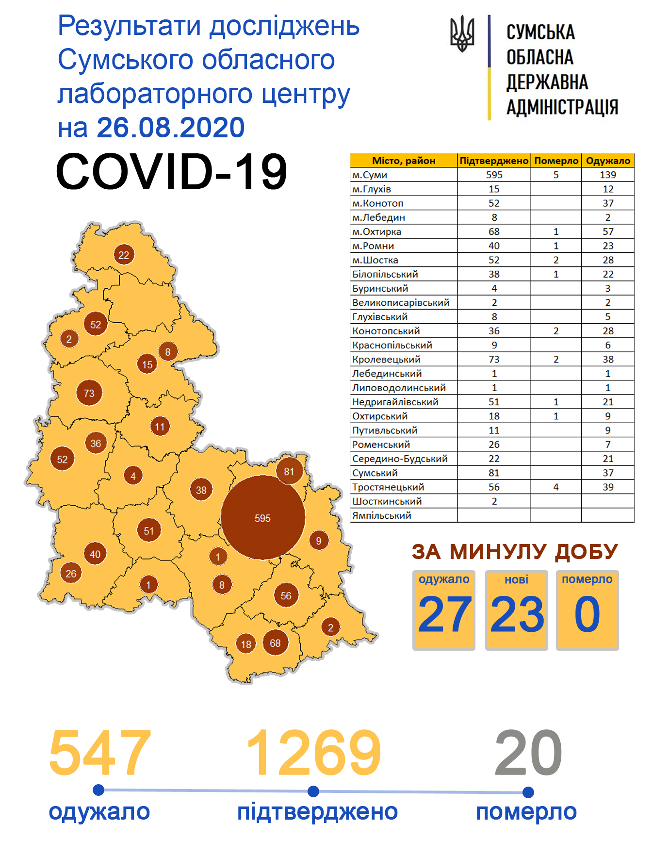 За минулу добу Covid-19 підтвердили у 23 осіб: м. Суми – 13, Сумський р–н – 4, Охтирка – 2, Роменський р–н – 1, Путивльський р–н – 1, Тростянецький р–н – 2.