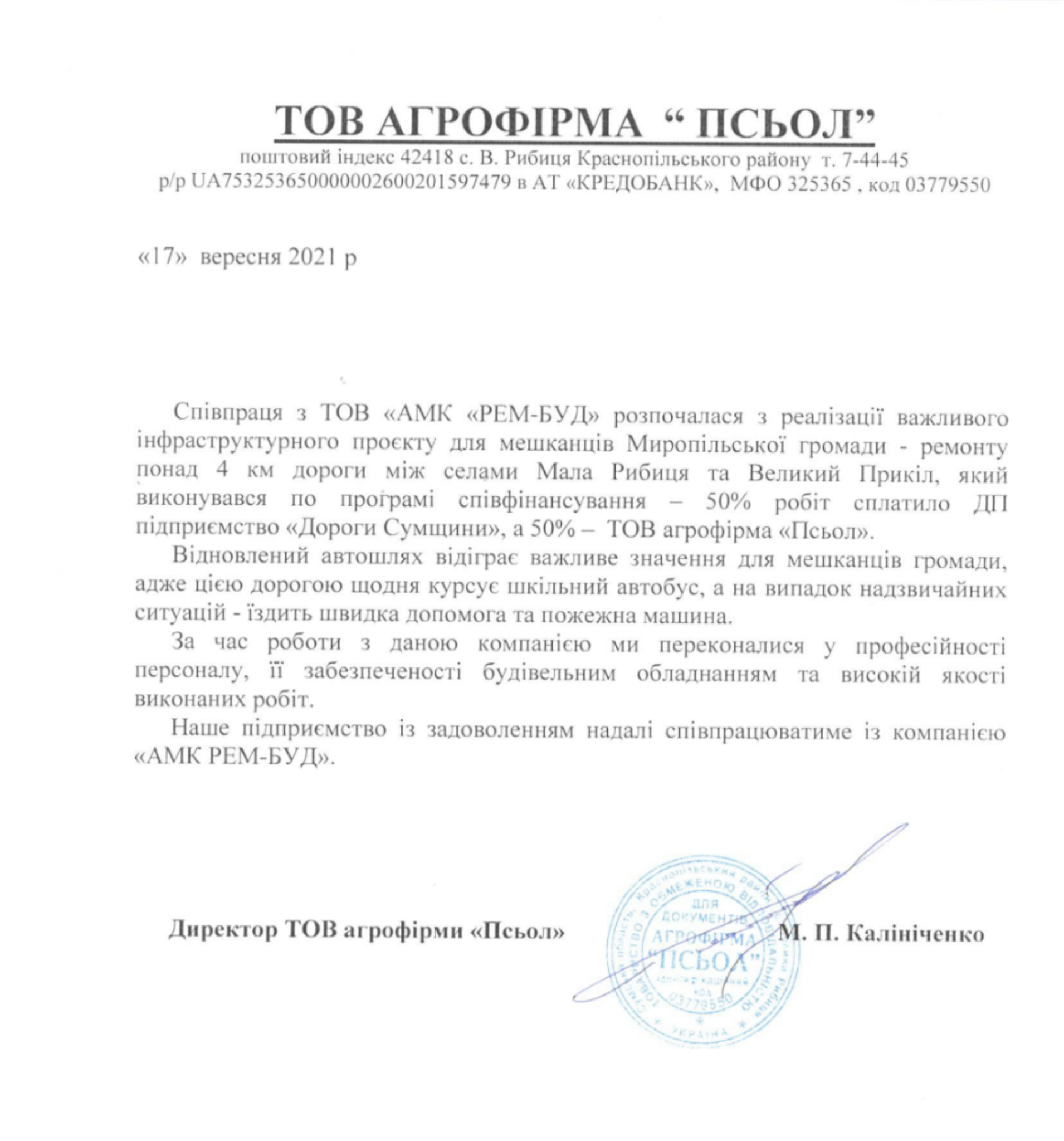 Директор агрофірми “Псьол” Микола Калініченко відзначив якість ремонту дороги, який виконала “АМК РЕМ-БУД“, а також професійність команди і високе забезпечення підприємства сучасною дорожньою технікою.