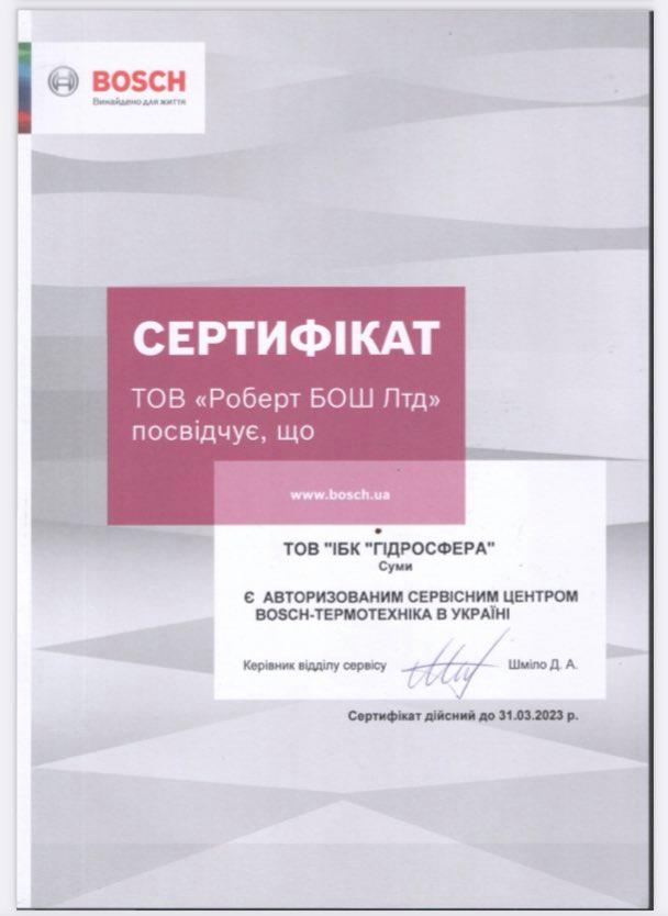 Підтвердженням цього є той факт, що «Гідросфера» має статус авторизованого сервісного центру BOSCH-Термотехніка в Україні. Працівники компанії надають послуги з сервісного гарантійного обслуговування, налагодження та монтажу обладнання відповідного бренду. Засвідчує це сертифікат від компанії ТОВ «Роберт БОШ Лтд».