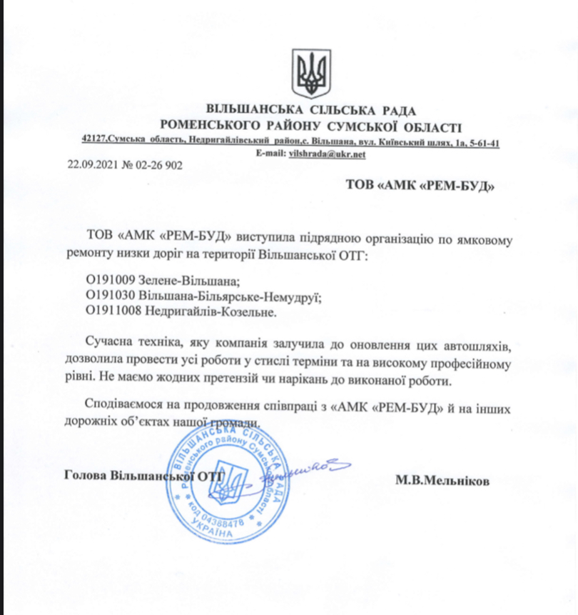«АМК РЕМ-БУД» виступила підрядною організацією по ямковому ремонту низки доріг на території Вільшанської ОТГ: О191009 Зелене-Вільшана, О191030 Вільшана-Більярське-Немудруї, О1911008 Недригайлів-Козельне. Сучасна техніка, яку компанія залучила до оновлення цих автошляхів, дозволила провести усі роботи у стислі терміни та на високому професійному рівні. Не маємо жодних претензій чи нарікань до виконаної роботи», – йдеться у відгуці за підписом очільника Вільшанської ОТГ Михайла Мельнікова.