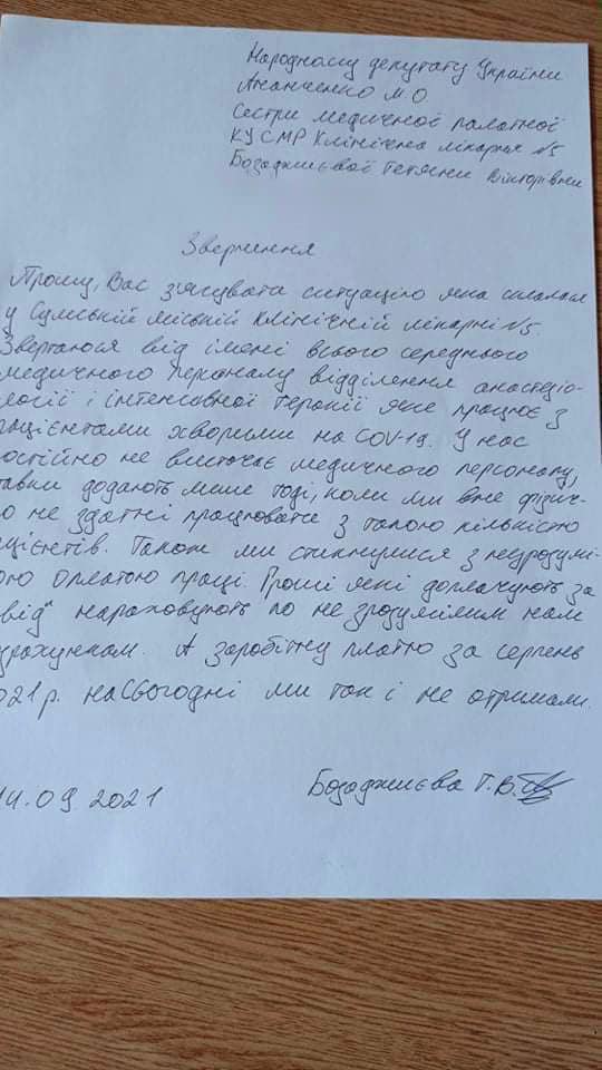 Далі цитую: “Ми працюємо з пацієнтами хворими на Коv-19 і весь час у нас не вистачає середнього і молодшого медичного персоналу! Ставки додають в обмеженій кількості,лише в той час, коли ми вже фізично не здатні працювати! Також оплата нашої праці відбувається за незрозумілим нам розрахунком, а за серпень місяць заробітної плати нам досі не заплатили!”