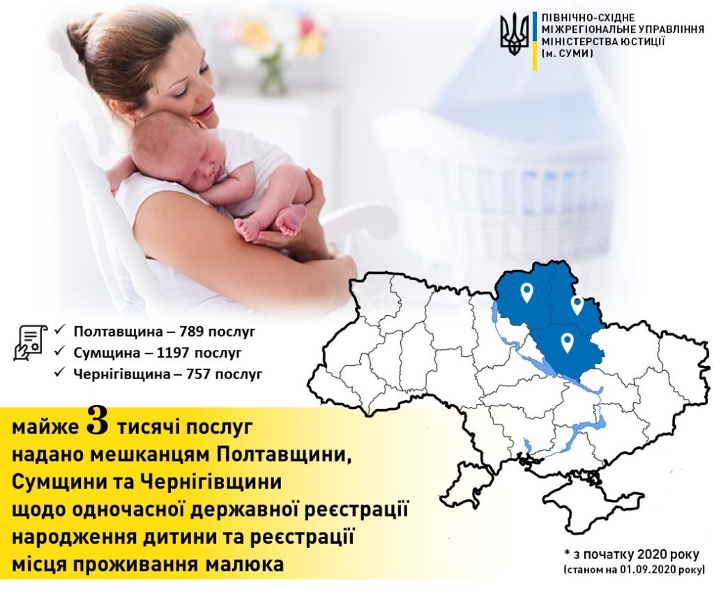 З початку 2020 року органи державної реєстрації актів цивільного стану Північно-Східного міжрегіонального управління Міністерства юстиції (м. Суми) надали близько 3 тисяч послуг щодо реєстрації місця проживання малюка одночасно з проведенням державної реєстрації народження дитини.
