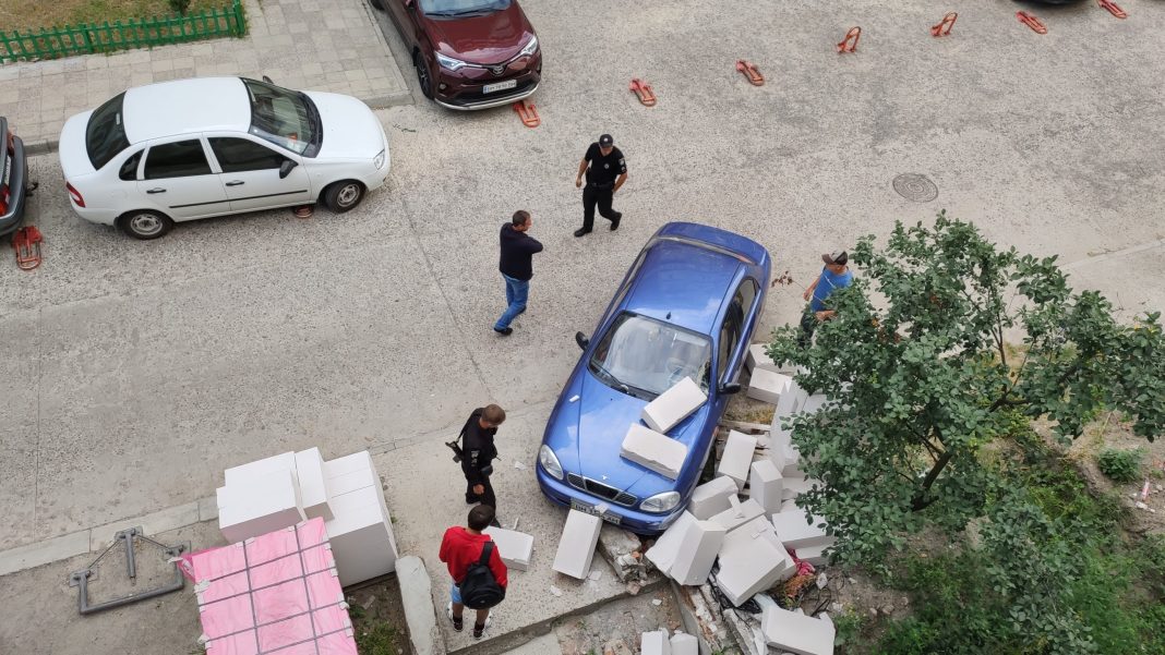 Водій автомобіля “Ланос” із незрозумілих причин спочатку пошкодив припаркований автомобіль “Toyota RAV4”, а потім врізався у складені поряд із будівлею газобетонні блоки.