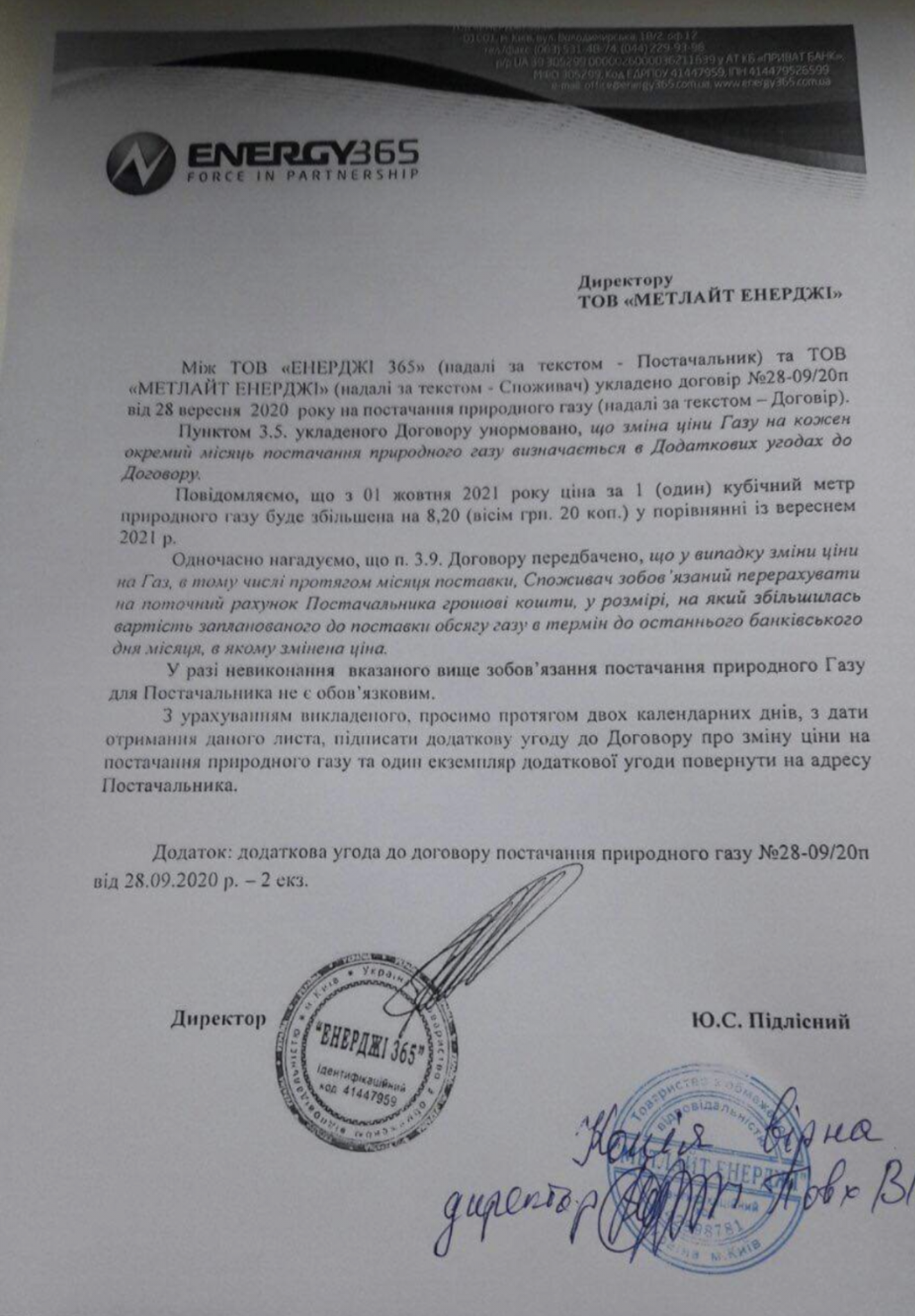 “Повідомляємо, що з першого жовтня 2021 року ціна за (один) кубічний метр природного газу буде збільшена на 8,20 ( вісім грн 20 коп) у порівняні із вереснем 2021 року” , – йдеться у повідомленні ТОВ “Енерджі 365”.
