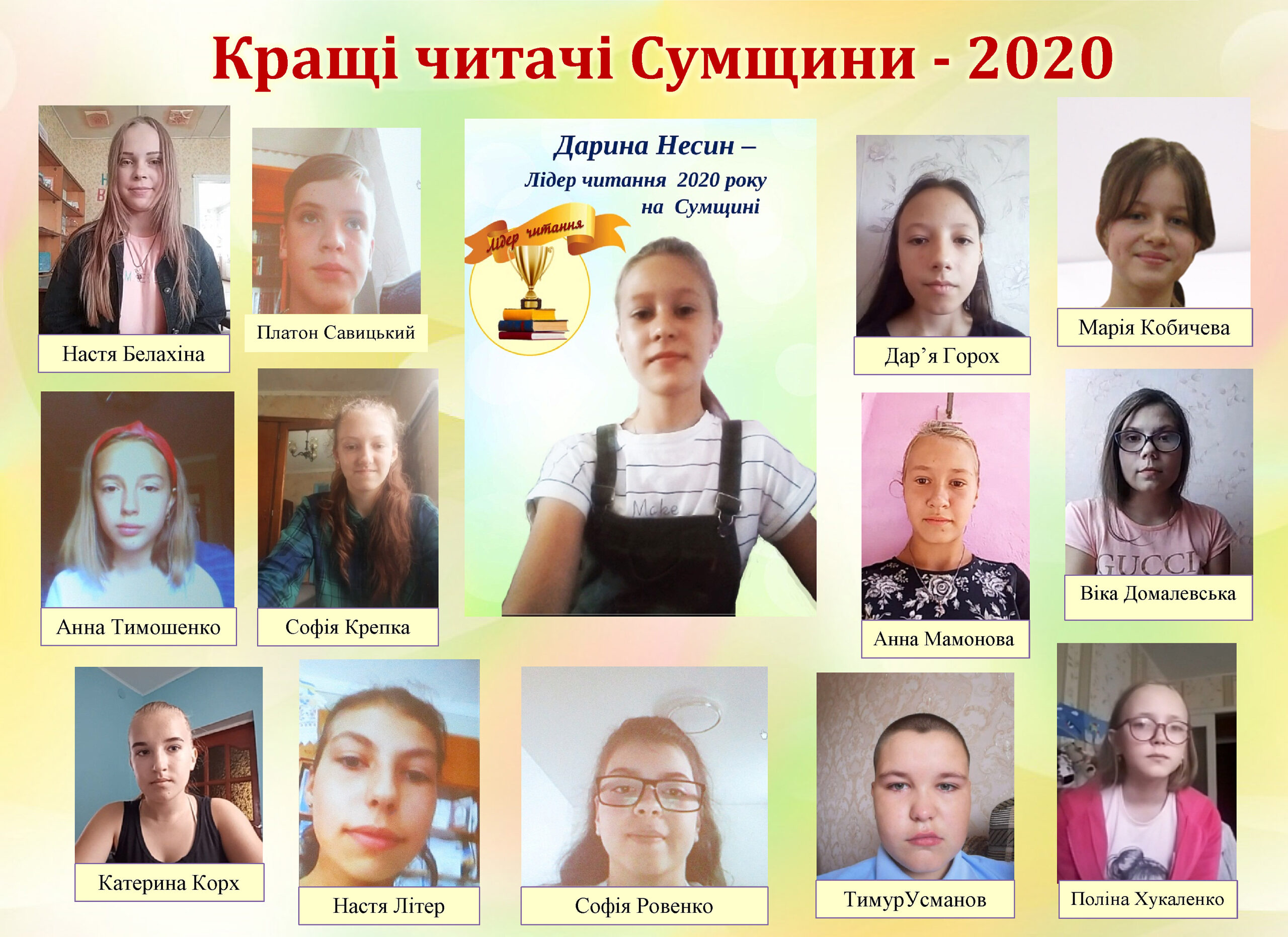 Не можемо не відмітити Настю Белахіну (Шосткинська центральна районна бібліотека для дітей), Марію Кобичеву (Сумська обласна бібліотека для дітей), Настю Літер (Великописарівська центральна дитяча бібліотека), Платона Савицького (Глухівська бібліотека для дітей), Ганну Тимошенко (Конотопська центральна дитяча бібліотека) та Тимура Усманова (Тростянецька дитяча бібліотека-філія), які підкорили членів обласного журі Конкурсу своєю щирістю, ерудованістю, начитаністю, розумінням потреби читати.