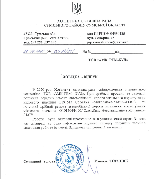 «Роботи були виконані професійно та в установлений строк. За весь час співпраці не було зафіксовано жодного випадку порушень термінів виконання робіт та їх якості. Зауважень та претензій не маємо», – ідеться у тексті відгуку за підписом селищного голови Хотіні Миколи Торяника.