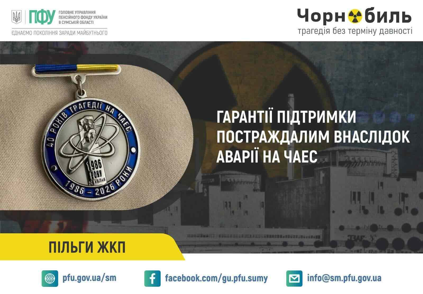 Головне управління Пенсійного фонду України в Сумській області продовжує ефективно реалізовувати державні програми соціальної підтримки населення. Одним із важливих напрямків щоденної роботи відомства є забезпечення стабільних виплат та пільг на житлово-комунальні послуги (ЖКП) для громадян, які постраждали внаслідок аварії на ЧАЕС. Прозорість умов, адресність допомоги та зручність сервісів залишаються пріоритетом установи.