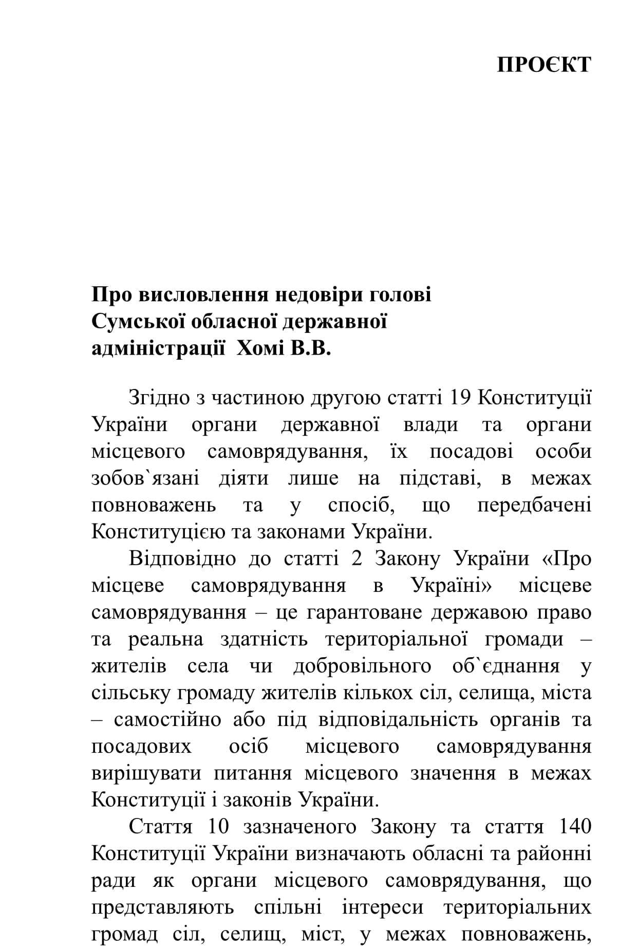 У середу, 28 квітня, відбудеться сесія Сумської обласної ради. До порядку денного вносять питання про висловлення недовіри голові Сумської облдержадміністрації Василю Хомі.