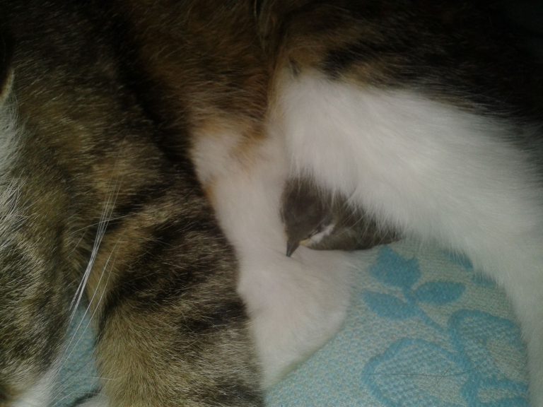 За словами співрозмовниці, вони з чоловіком були впевнені, що хижачка-кішка притягла собі здобич для прохарчування. Однак, домашня улюблениця ласувати пташеням не стала. Тварина взяла його під опіку і поводиться з пернатим по-материнськи: у зубах затягла на крісло, обігріваючи своїм пухнастим тілом.