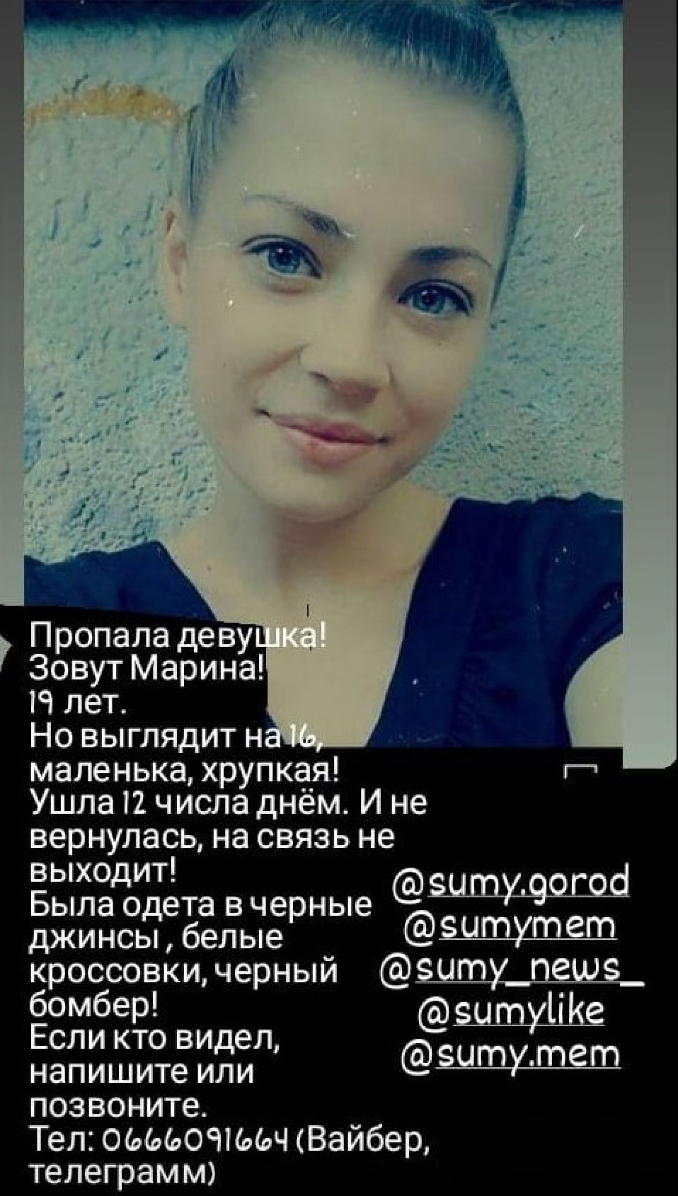 «Прошу допомоги!! Пропала моя донька!! Якщо є будь-яка інформація, може хто її бачив, телефонуйте на номер 0661378912 або ж 102!!! », — написала вона у Фейсбуці.