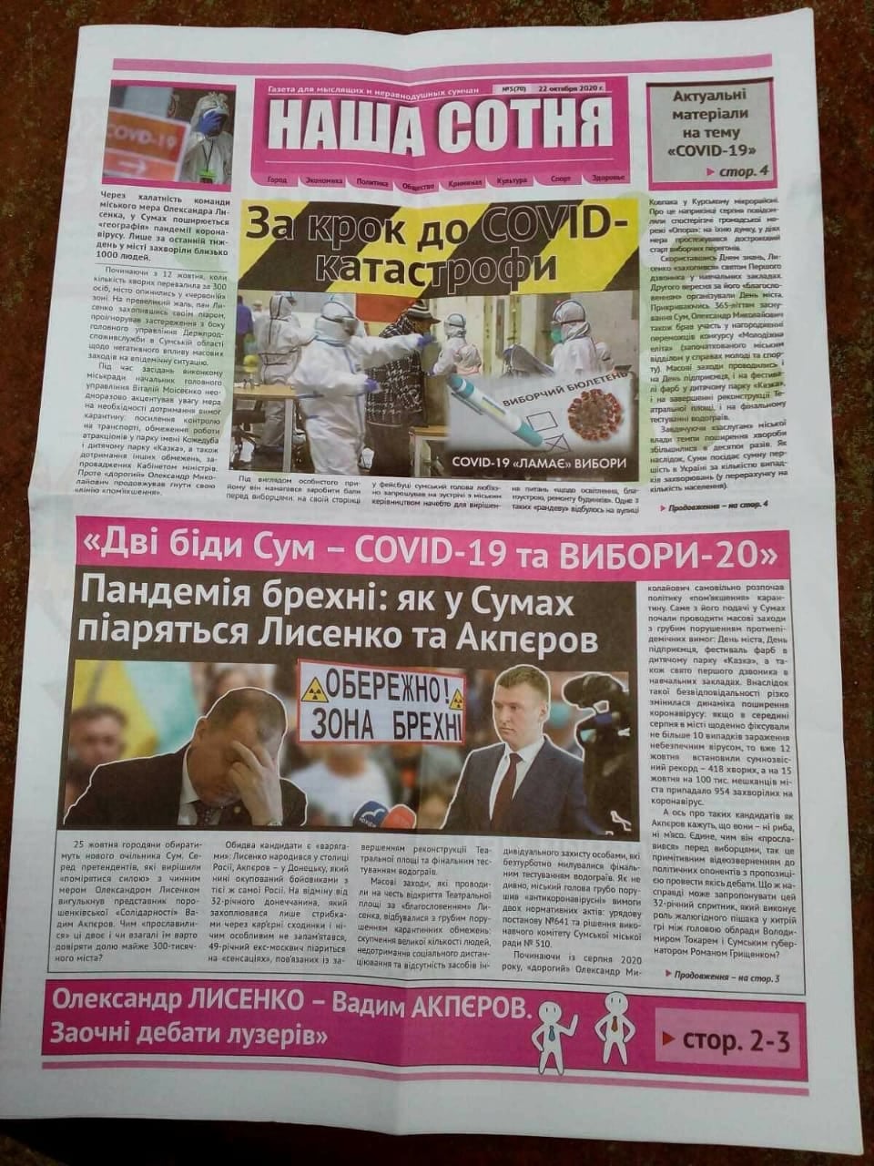 «Хочу поінформувати громадськість стосовно видавництва в Сумах фейкової листівки «Наша сотня». Так сьогодні мені показали газету «Наша сотня» №5 (70) від 22 жовтня 2020 року, яку начебто видав Заварило Богдан Володимирович. У зв’язку із цим хочу повідомити наступне: