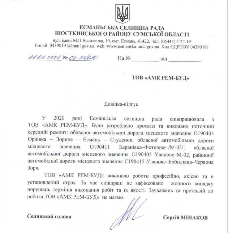 «ТОВ «АМК РЕМ-БУД» виконало роботи професійно, якісно та в установлений строк. За час співпраці не зафіксовано жодного випадку порушень термінів виконання робіт та їх якості. Зауважень та претензій до роботи ТОВ «АМК РЕМ-БУД» не маємо, – йдеться у відгуку за підписом селищного голови Есмані Сергія Мінакова.