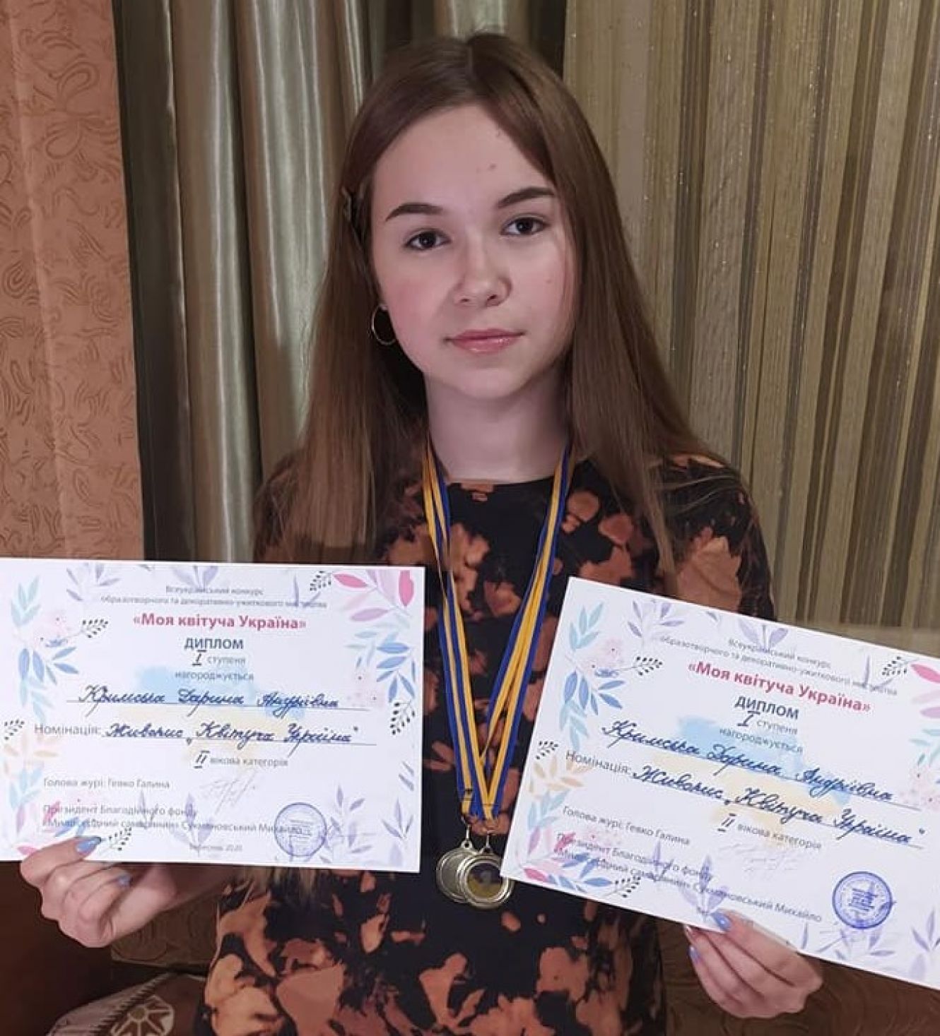 «Радісна новина! Моя учениця Кримська Дарина — переможиця у Всеукраїнському конкурсі образотворчого та декоративного мистецтва «Моя квітуча Україна». Даша отримала зразу два диплома 1-го ступеня, за дві роботи. Щиро вітаємо переможицю! Дуже рада успіху Дарини, вона старанна, вихована та талановита дівчинка! Молодець!», — написала вона у Фейбсуці.