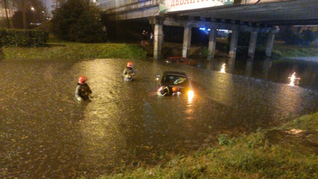 В Ивано-Франковске прошел сильный ливень. На перекрестках и под мостами образовались озера, а спасатели были вынуждены вылавливать плавающие автомобили.