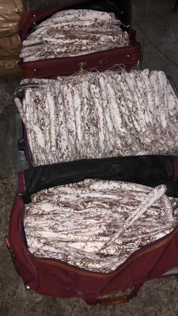 Так, при пересечении границы мужчина задекларировал только двигатель авто и личные вещи, однако при осмотре машины пограничники обнаружили 250 кг вяленой колбасы, спрятанной в сумках и надежно перемотанной скотчем.